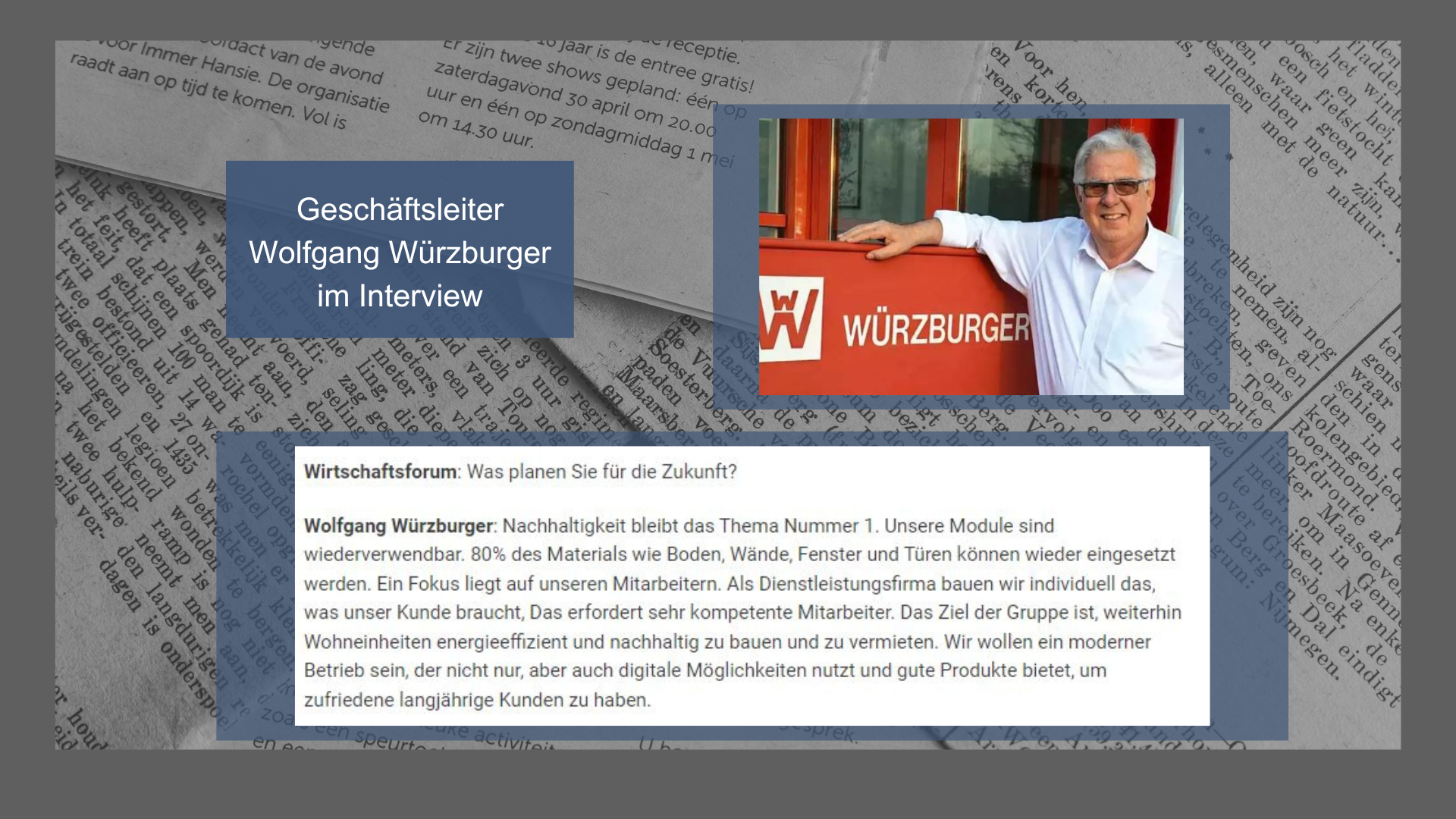 Aus diesem Grund geht es darum Produkte zu kreieren, die den individuellen Kundenwünschen entsprechend variabel gestaltet werden und der Gesellschaft zugutekommen können. Die Kundenanforderungen in modularen Raumeinheiten umzusetzend, ist die Würzburger Gruppe daher in vielen Bereichen tätig. Hierfür seien exemplarisch genannt: Einlagerung, Wohnen, Provisorien wie beispielsweise im sozialen und medizinischen Bereich, Büro- und Lagergebäude sowie Aufbauten.
